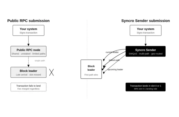 Syncro Sender is a Solana transaction sender built on P2P.org‘s validator infrastructure, designed specifically for execution-critical workflows. Several architectural choices differentiate it from standard RPC submission and from competing sender solutions.